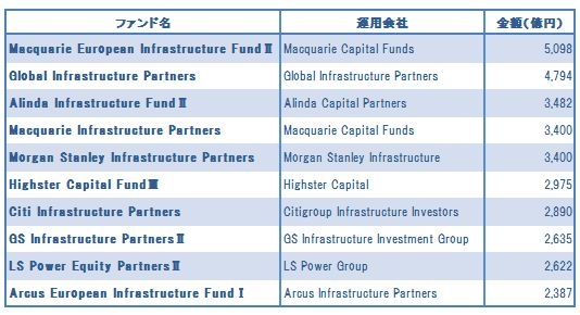 インフラファンドはもともと欧米などの先進国で1990年ごろから発展したもので、世界で20兆円の市場があると推測されています。ファンドの平均組成規模は過去5年間で20倍以上に拡大しており、最近ではマッコリー(豪)の5,000億円を超える大規模ファンドも出現しています(表)。 インフラ事業のライフサイクルは設備建設後の運営期間を含めると、20〜30年など長期にわたるビジネスです。もともと長期の視点での資金運用が求められるファンドの特性に向いていることに加え、世界経済の不透明感から株式市場が低迷していることもあって、年金基金など世界の機関投資家が運用先としてインフラファンドを組み込む動きが広がっています。