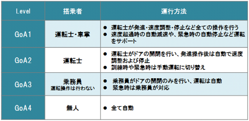 GoAとはUITP(国際公共交通連合)による鉄道の自動運転レベルを定める基準です。近年は自動車の自動運転が話題となっていますが、鉄道の自動運転は実用化されてから歴史が長く、無人で運行する鉄道は既に身近なものとなっています。これまで運転士が列車の運転を行い、車掌が周囲の安全確認やドア開閉などを行ってきました。自動運転により、発進操作以外の速度調整、ブレーキ操作が自動になることで運転業務負荷が低減し、運転士が車掌業務を兼務するワンマン運転が可能となります。またヒューマンエラー低減による安全性の確保、定時運行、運送効率の向上および省エネなどに貢献しています。一部の先進国では人口減少に伴う要員確保の問題が予想されるため、自動化・無人化は将来の鉄道事業を維持するための一つの解決策として注目されています。