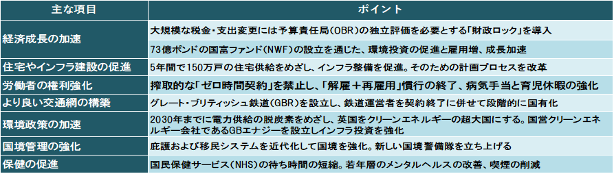 7月17日に上院でチャールズ国王が行った施政方針演説(King’s Speech)では、労働党が掲げていた政権公約に沿う形で、39の新たな法案が提示された。ポイントは表2に示した通りである。