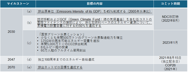 資料:“India’s Updated First Nationally Determined Contribution Under Paris Agreement (2021-2030)”、“India’s Long-Term Low-Carbon Development Strategy” (2022)、“National Green Hydrogen Mission” (2023)より日立総研作成