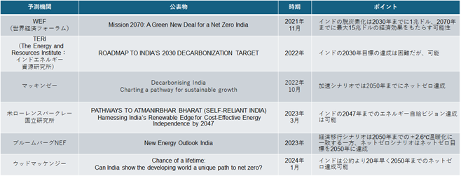 多くの国際機関・研究機関がインドの脱炭素化/エネルギーに関する見通しを公表している(表2)。このうち、WEF(世界経済フォーラム)の白書は、インドがネットゼロ経済へ移行するためには、五つの部門(①エネルギー、②モビリティ、③産業、④グリーンビルディング、⑤農業)におけるグリーンニューディールが必須と指摘している。特にモビリティ(交通)部門は、インドの石油需要の約半分を占め、石油依存度が高い。道路交通量の増加により、石油需要が過去20年で倍増する中、輸入依存度も上昇を続けている。そのためインド政府は、バイオエタノールのガソリンへの混合率を 20%にする目標(E20)を掲げるなど、燃料を多様化する政策を推進中である。中長期的な政策(EV化、水素利用)の模索と並行して、短期的にはバイオエタノール・CNG(圧縮天然ガス)などの多様な燃料を組み合わせる現実的な政策を採用している形である。