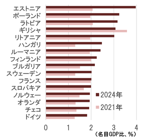 EUの防衛力と産業基盤強化に向けたボトルネックとして、財政規律を維持したまま財源を確保せねばならないというEU特有の問題があった。EUではコロナ禍で2020年より停止していた財政規律維持の枠組みが2023年より再開され、中東欧やバルト諸国などでは、増大する軍事費との両立が困難さを増していた(図1)。